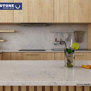 Lấy cảm hứng từ đá cẩm thạch tự nhiên, sản phẩm Vicostone Valley White độc đáo với hiệu ứng vân rối màu tối xuất tiện trên bề mặt nền trắng tinh tế