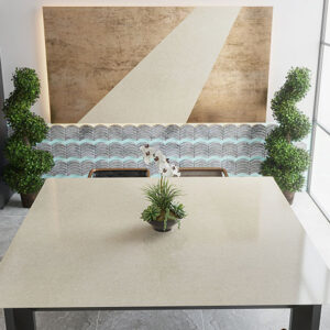 Dòng sản phẩm với thiết kế các dải hạt lớn tạo hiệu ứng trầm tích theo thời gian, tổng thể toàn tấm mang màu trung tính, dễ dàng phối hợp với các loại tủ bếp.