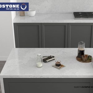 Lấy cảm hứng từ đá cẩm thạch tự nhiên, sản phẩm Vicostone Monterosa độc đáo với hiệu ứng vân rối màu tối xuất tiện trên bề mặt nền xám mạnh mẽ
